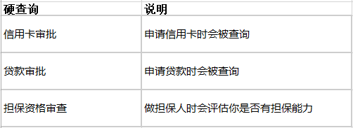 其中的贷款审批、担保资格审查、信用卡审批查询均属于“硬查询”。而像异议查询、本人查询、贷后管理均属于“软查询”。
