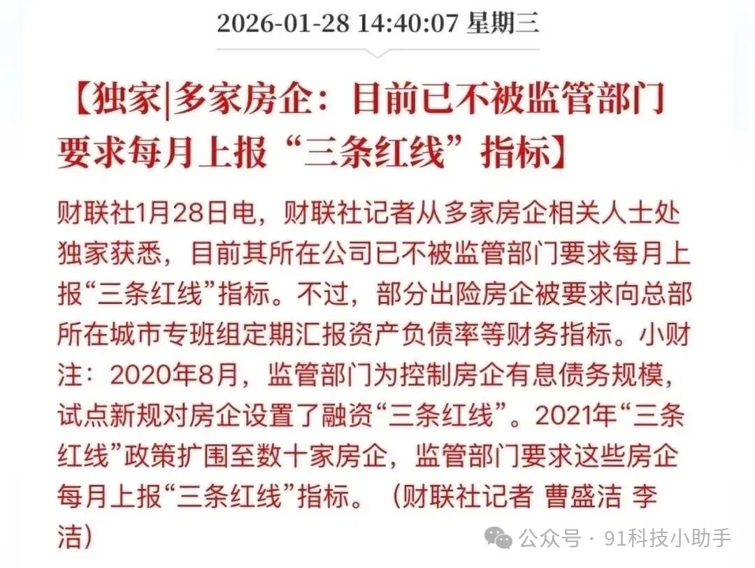 财联社发布的最新关于楼市的新闻,多家房企表示已不再上报三条红线指标。
