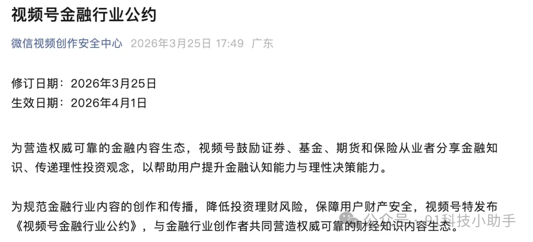 微信视频号发布金融行业公约,凡在视频号视频、名字、简介、背景图中宣称“基金经理”“基金公司”“证券公司”等体现账号具备专业资质或官方职业身份的账号,必须完成职业认证(证券、基金、期货从业者)或机构认证,机构认证时须在主体信息页面选择对应行业(金融相关)并按页面提示上传资质材料。该公约将于4月1日正式生效。